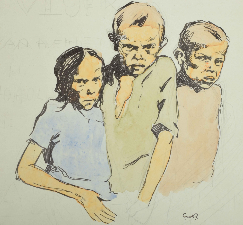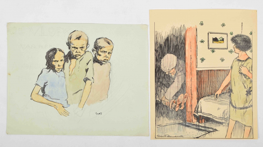 Portrait of 3 children. In background working title in pencil "De vloek van het alkohol". 19.5 x 24.5 cm. + a man is carried horizontally into a room. Unpublished drawing. 22 x 18.5 cm. Both in India ink with watercolour.