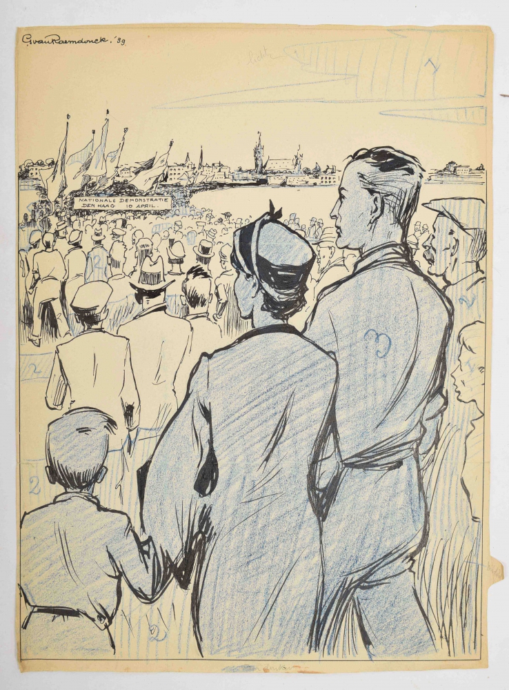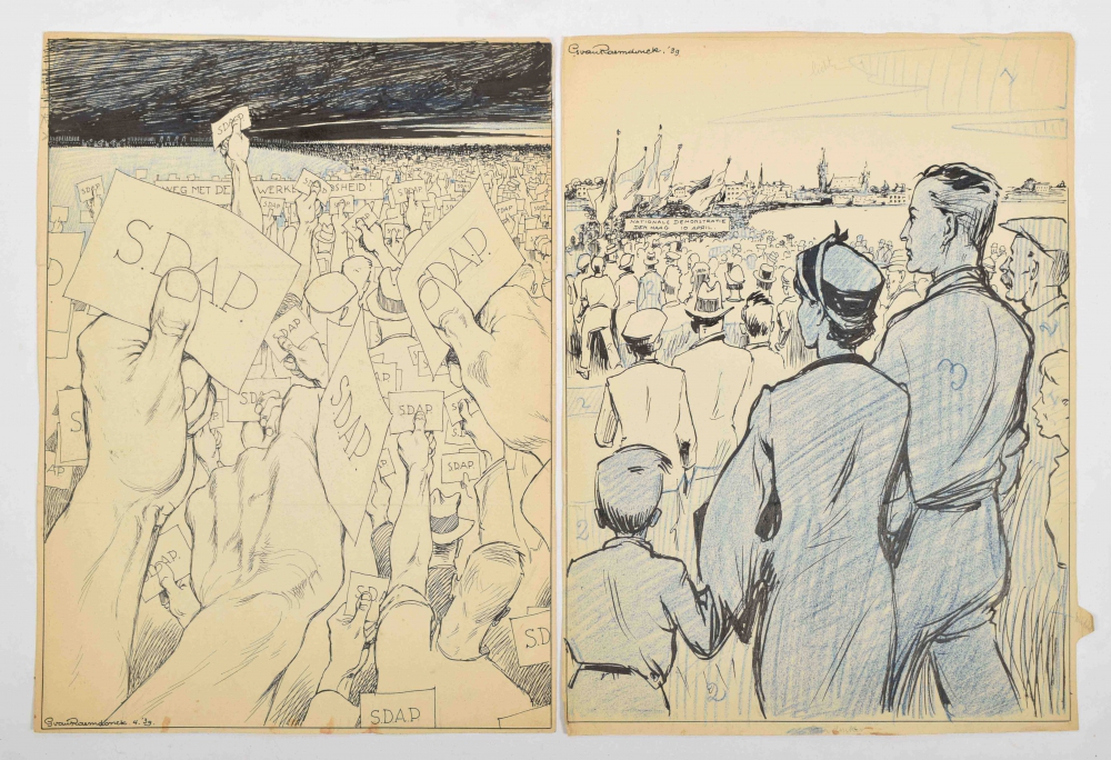 S.D.A.P. + Nationale Demonstratie Den Haag 10 april. Two full-page prints in India ink with blue spot colour. Each 38 x 28 cm.