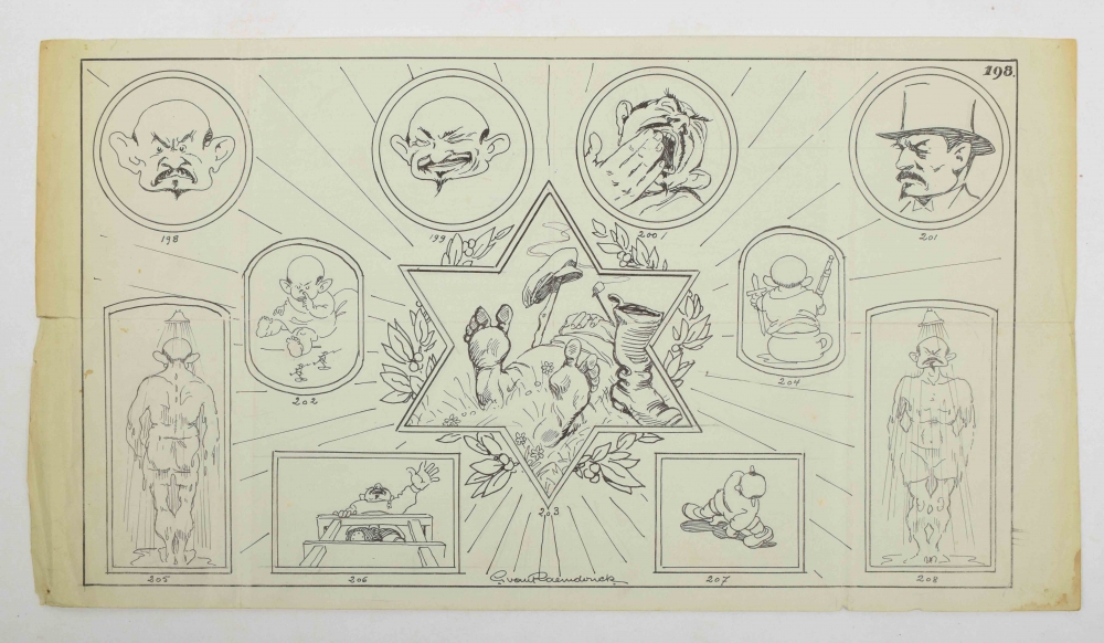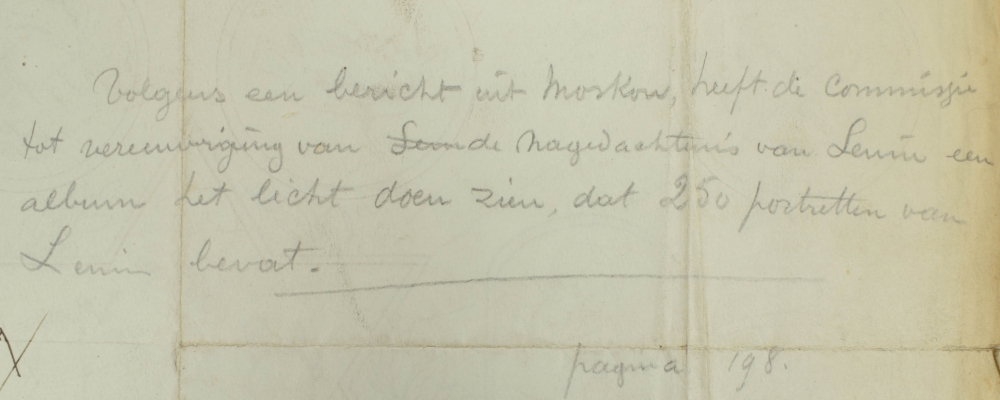 Cartoon: "Volgens een bericht uit Moskou, heeft de Commissie tot vereeuwiging van de nagedachtenis van Lenin een album het licht doen zien, dat 250 portretten van Lenin bevat". 1924. India ink on thin paper. 19.5 x 36 cm.
