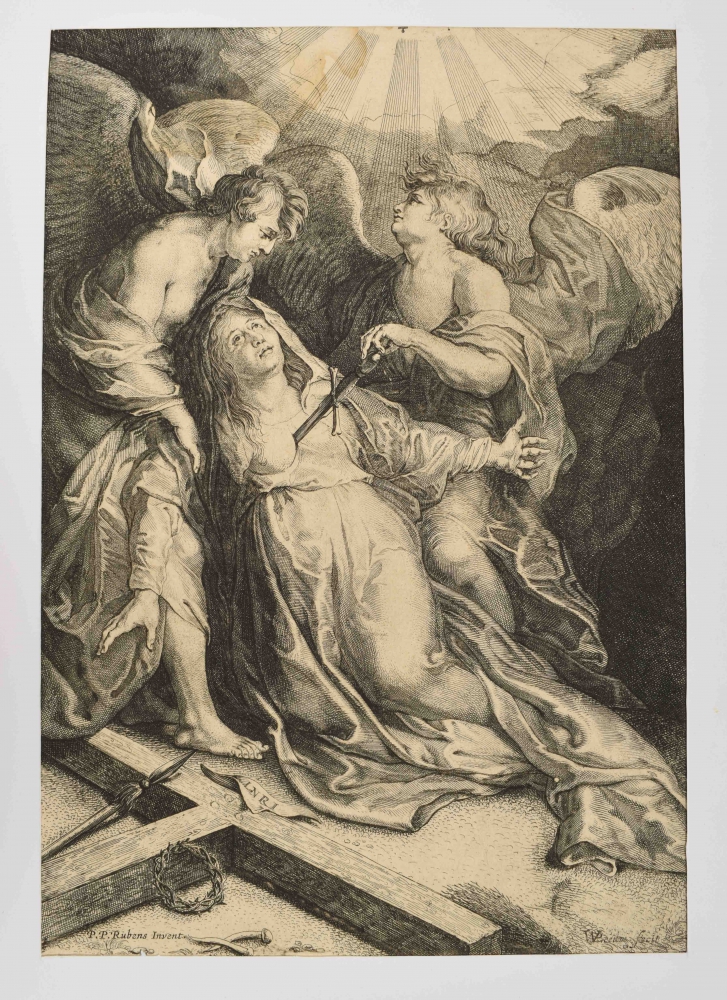 Incl.: (1) De boetvaardige Maria Magdalena (Maria Magdalena doet afstand van aardse ijdelheden) by Lucas Vorsterman I (1595-1674), Hollstein, Lucas Vorsterman 89; Voorhelm Schneevogt p. 116, cat. no. 53; mounted with top corners to holder; (2) "Maria Mater dei Regina Caeli" by Hans Witdoeck (1605-in or after 1642), Hollstein 11, second state of 2 (with address of J. de Berti in print; with very wide margins); (3) "S. Ursula M." (Martelaarschap van de H. Ursula) by Philippe Spruijt (1727-1801) (mirrored relative to a copy at the Rijksmuseum; with folds). (total 5)