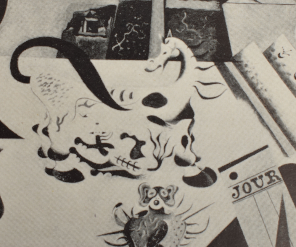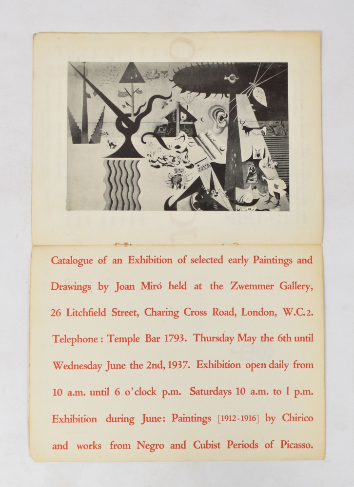Catalogue of an Exhibition of selected early Paintings and Drawings by Joan Miró held at the Zwemmer Gallery, London, 1937. 6 pp. With tipped-in lithograph and lithograph on front. Small 4to, stapled.