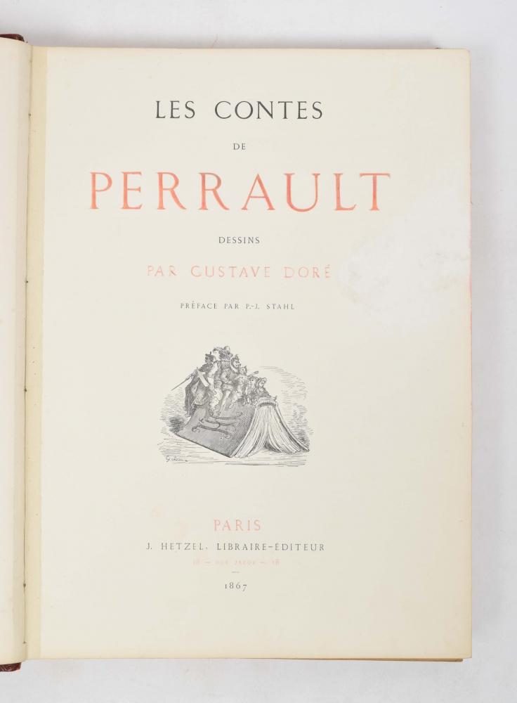 Contes de Perrault. Edition Hetzel, Paris, 1867. Folio, in red cloth with gilt title and title illumination.