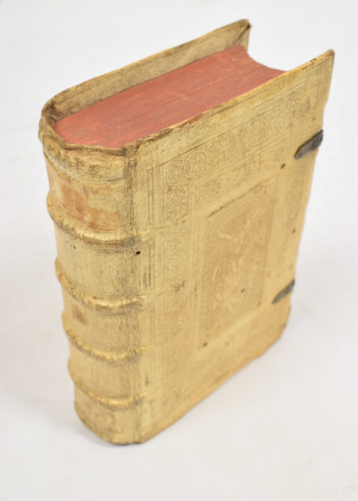 [Renaissance binding] Book binding of profusely blindstamped pigskin across wooden boards,