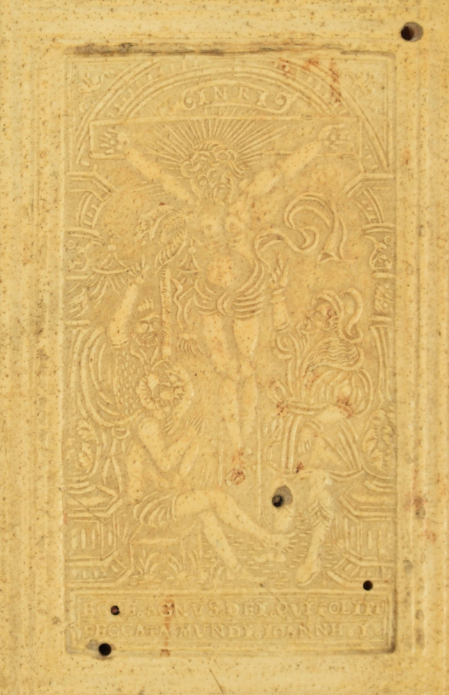 c. 1584, front board with centered panel stamp with Christ on the cross, back board with similar stamp with the resurrection of Christ, both panel stamps surrounded by roll stamps, else a ribbed back and two copper clamps, 18 x 13 x 5.5 cm.