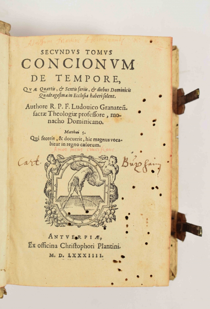 Back board with a few minimal wormholes, front board with several wormholes. Bound around: a Plantin edition 1584 (volume 2 of 4 volumes by Luis de Granada, with many wormholes). An old antiquarian's strip to the inside of the back board, on which is indicated that the binding is presumably the work of bookbinder HIF, of whom Haebler lists only 3 bindings (all in Stuttgart). Haebler suspects a workshop at Wengen, supported by owner's mark "Cart. Buxheim" (famous monastic library, see also lot 314 in this auction) on the title page. "Haebler I, 203, Rolle 2 (?) Platten I u. II".