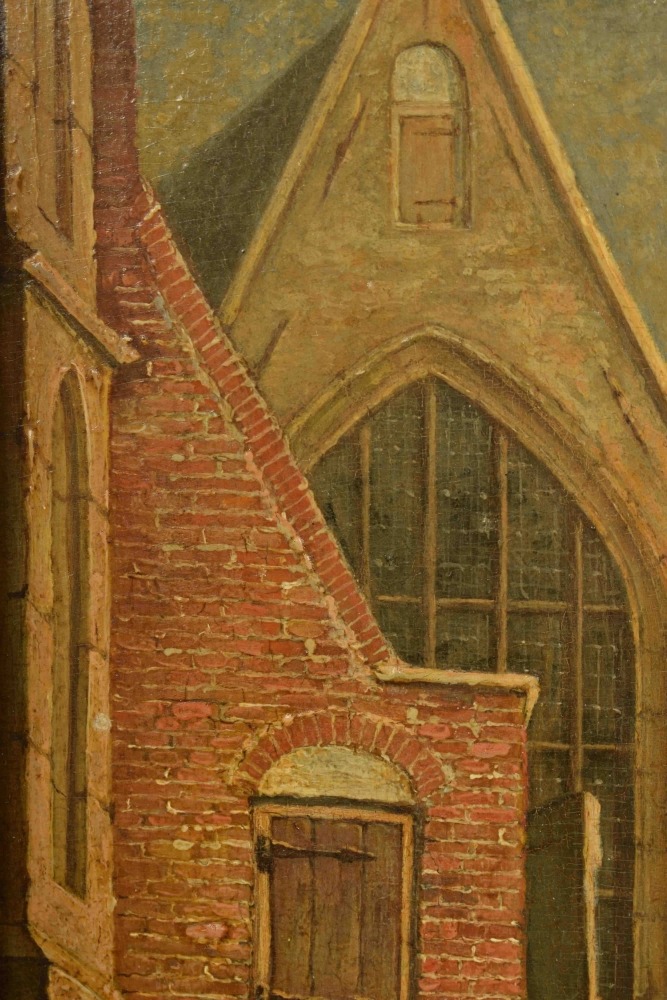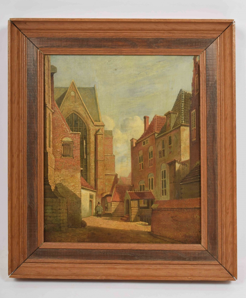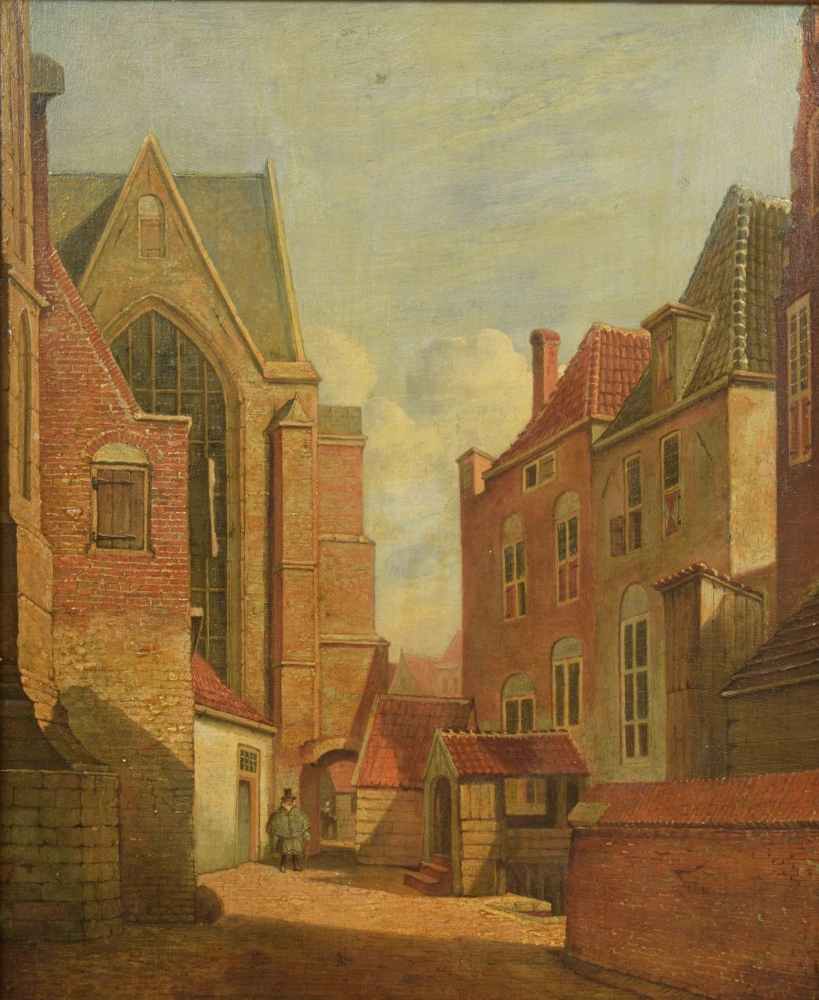 Dutch School, 19th century. (View of an alley with large church in the background).
