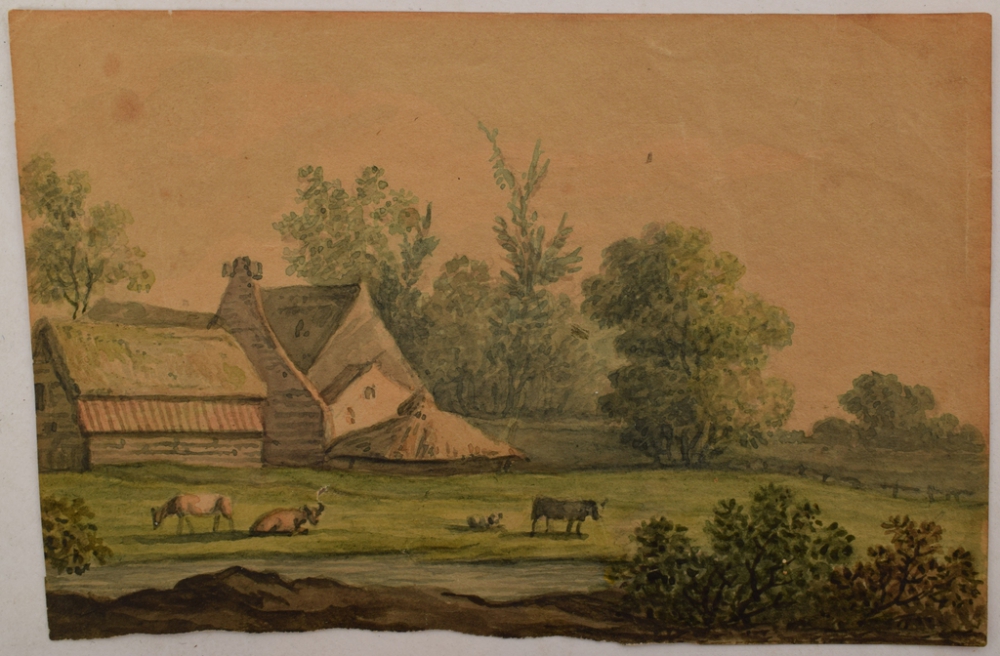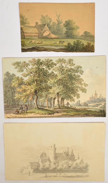 (2) Idem. (View of a farm with cows). Gouache/ watercolour, 7 x 10.7 cm., monogrammed "IA" and dated 1836 verso (yellowed); (3) L. Apeldoorn (c. 1850). "Amersfoort le 4 Juillet 1852". Drawing in pen and grey ink, greywashed, leaf 9 x 15 cm., titled and dated and "Souvenir de votre frère L. Apeldoorn" in pen verso (remains of holder verso). (total 3)