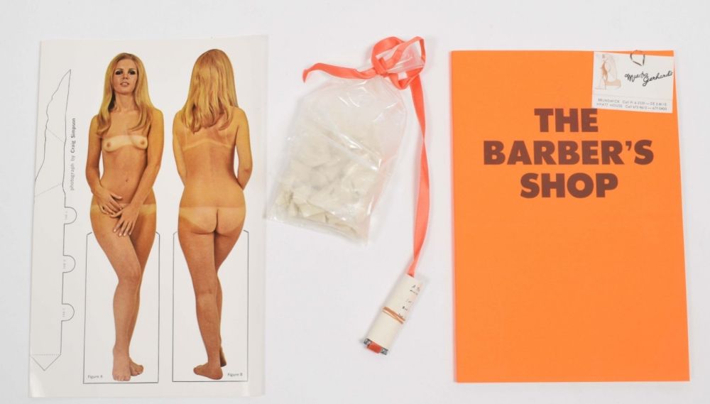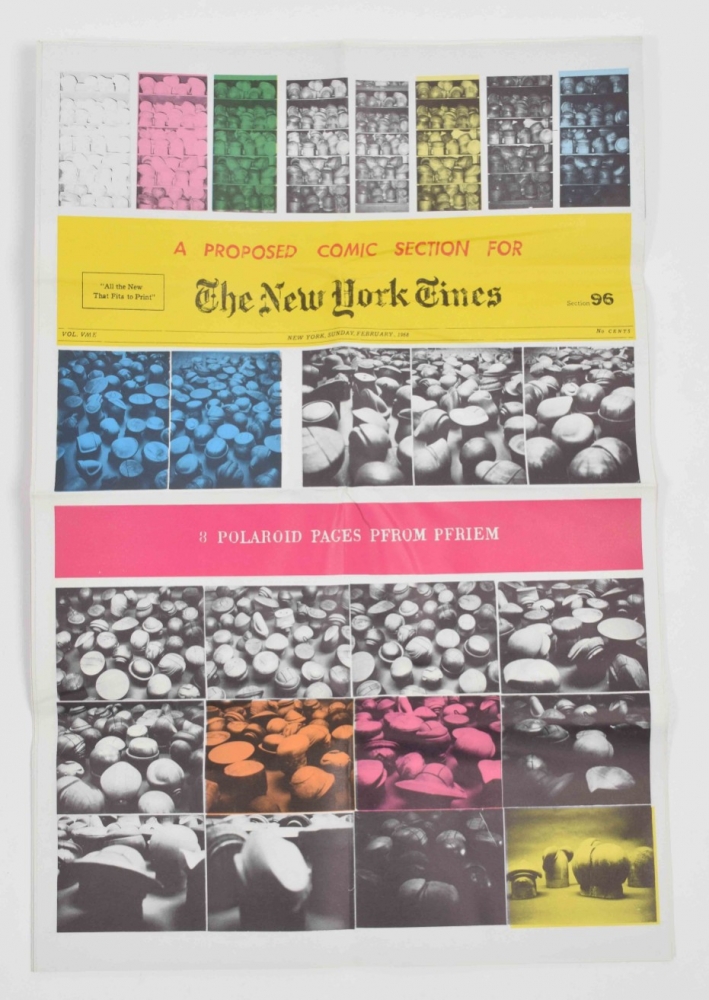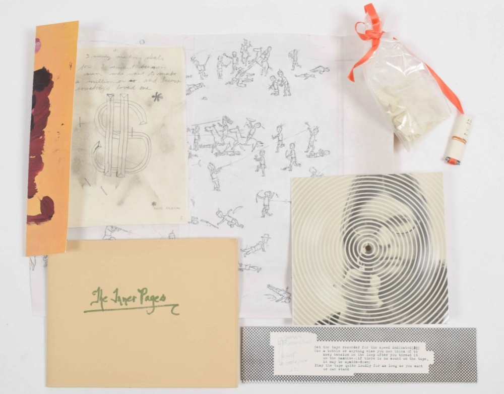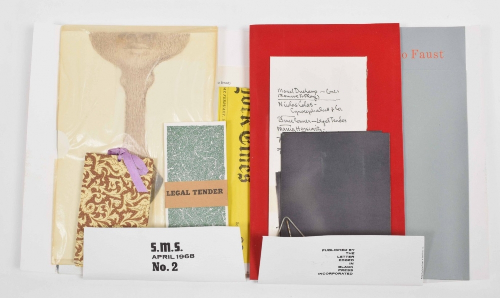 Among the amazing contributors are James Lee Byars, Christo, Richard Hamilton, Kaspar Koening, La Monte Young and Marian Zazeela, Marcel Duchamp, Ray Johnson, Lee Lozano, Meret Oppenheim, Man Ray, Hannah Weiner, Bruce Nauman and Yoko Ono. The shipping carton experiences some aging, but the portfolio and multiples are in mint condition. (total 4)