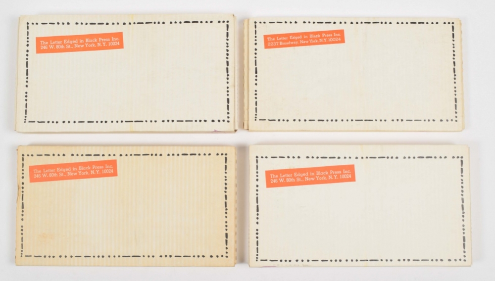 Four issues (of 6 total) of the phenomenal art collection in a portfolio assembled by William Copley in an edition of approx. 2.000. Published by The Letter Edged in Black Press, New York and sent to subscribers over the course of 1968. All issues contain around 11-14 small-scale multiples in various media from prints, die-cut assemblages, handwritten letters to cassette tapes. This set includes No.1, 2, 3 and 5 in their original cardboard boxes.