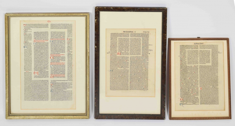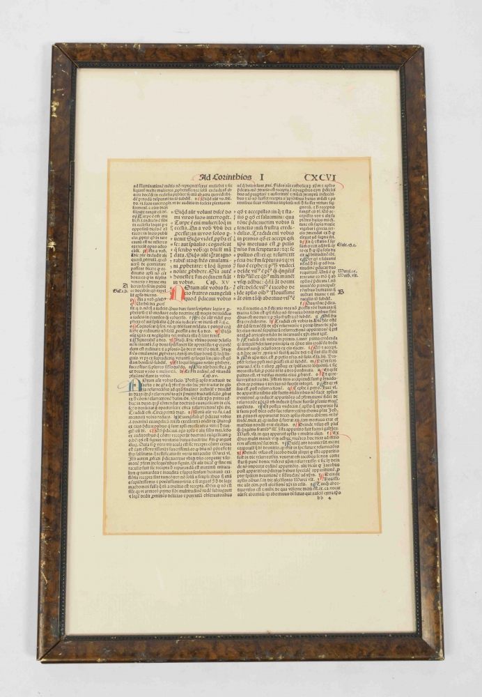 1. Leaf from Biblia Latina. Nuremberg, 1497. Leaf CCX/dd2. Small folio. Epistle to the Galatians; framed with extensive inscription on reverse frame. 2. Leaf from Biblia Latina. Nurmberg, 1497. Leaf CXCV/bb4. Large folio. 1 Corinthians; framed with extensive inscription on reverse frame.