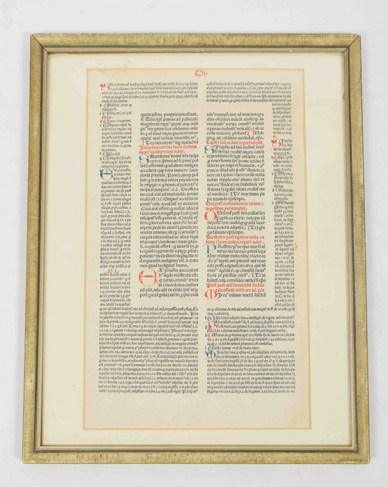 3. Leaf from the Decretum Gratiani. Venice, 1479 or 1480 (see commentary reverse frame). Leaf e8 (without signature. Large folio. A lovely example of an early Venetian incunable leaf. The 3 leaves with various capitals and lettering in red or blue. (total 3)