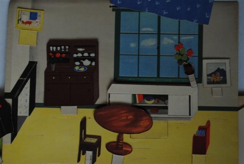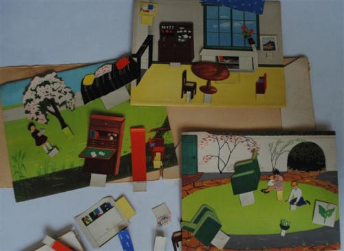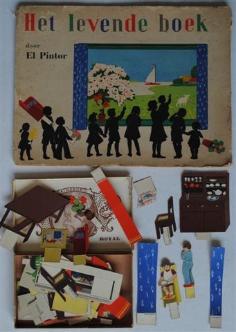 This item contains no English description. See the Dutch description: Het levende boek. 3 bladen (kamer, tuin, grasveld) in orig. map met losse figuren (mensen en meubilair). Curieus.