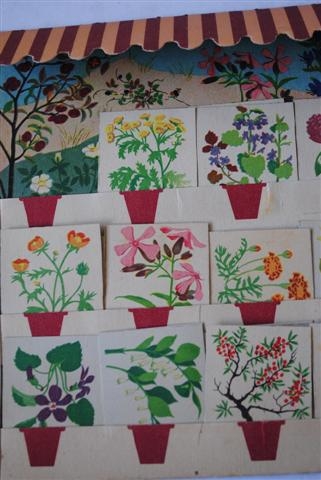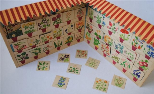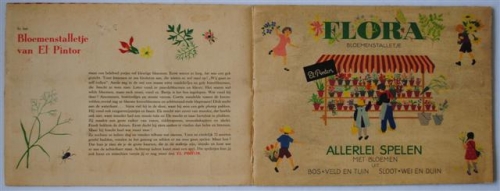 See the Dutch description: Flora. Bloemenstalletje. Allerlei spelen met bloemen uit bos, veld en tuin, sloot, wei en duin. Map uitklapbaar tot bloemenstalletje met losse plaatjes met planten met op keerzijde naam van de plant en de plaats waar ze te vinden zijn. ("Kardinaalsmutsje / duin.") Lief, schattig en leuk en in goede staat.
