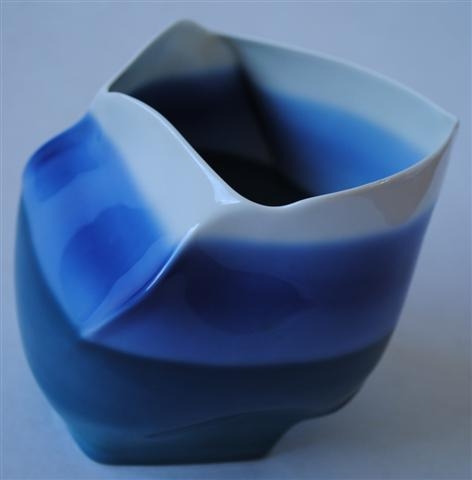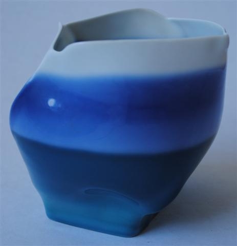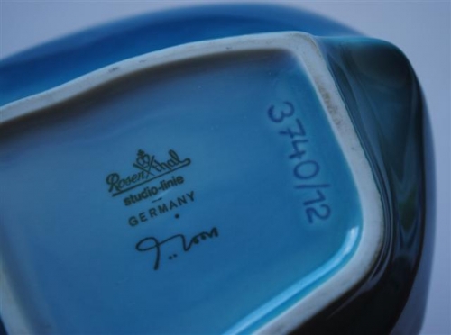 This item contains no English description. See the Dutch description: LOON, JOHAN VAN. Porseleinen vaasje met blauw groene lijnen. Uiv. Rosenthal. Hoogte ca. 11 cm.