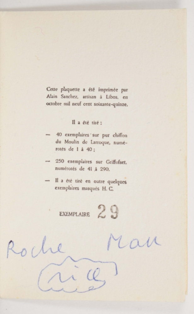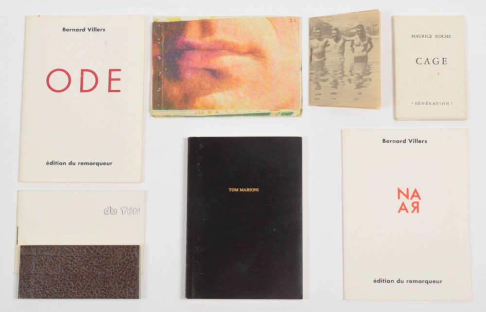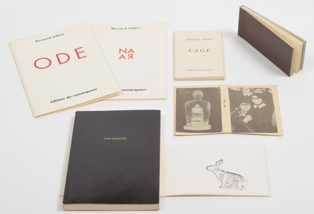 Maurice Roche, Cage. Libos, Generation, 1975. 8.5 x 6 cm, 20 pp. Numbered 29/40 and signed 'for Annie'. + Patrick Lucchini, du Yeti. Geneva, Ecart Publications, 1973. 6.5 x 10.5 cm. + Carlos Garcia and Patrick Lucchini, Pour John. Geneva, Ecart Productions, 1975. 4 x 9.5 cm. Numbered 35/150. Faux leather hc with tiny hand stamped texts for John Armleder. Mint copy.