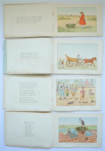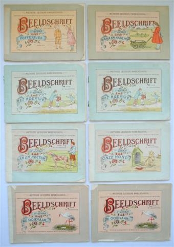 See the Dutch description: Methode Leidsche Kweekschool. Beeldschrift door W. Haanstra. Leiden, Mevrouw de Bock - Hardenberg / W. Haanstra, z.j. LOT met 8 deeltjes uit deze reeks, waaronder doublures. IIe (2x), VIe, VIIIe, Xe (2x), XIVe en XVIe stukje. Enkele deeltjes rug (lelijk) met tape gerestaureerd. (totaal 8)