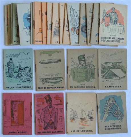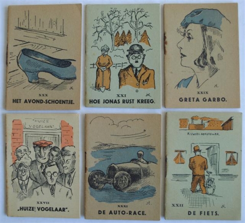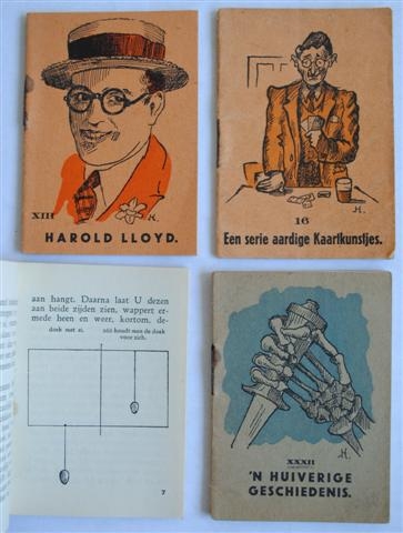 See the Dutch description: 27 Deeltjes uit de reeks. Klein formaat reclameboekjes, geniet, 32 pag., ca 1930. Met o.a. Harold Lloyd, Greta Garbo en Toen de Zeppelin kwam.