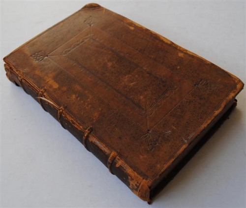 Voorste scharnier deels gebroken, rug bovenaan besch. met klein verlies. Onderhoek achterplat besch.