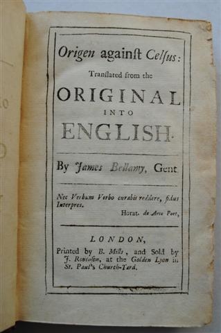 See the Dutch description: BELLAMY, JAMES. Origen against Celsus: Translated from the original into English by -. London, Mills / Robinson, n.d. 223, 203 p. orig. leer. Voorste scharnier deels gebroken, rug bovenaan besch. met klein verlies. Onderhoek achterplat besch.