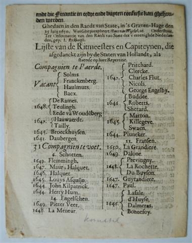 See the Dutch description: Concept ofte Doorslagh Ten regarde van de Militie van syn Hoogheydt, Sijn Excell. Stadt-houder, Ende den Raet van Staten; overgebracht ter Vergaderinge van hare Hoog Moog. den 15 Julij 1650. Delf, Simon Iansz, 1650. 4 p. met pap. omsl. Rug met tape versterkt (net)