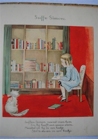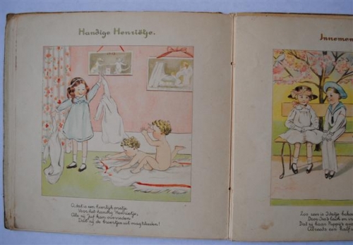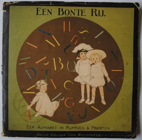 See the Dutch description: VOLKER VAN WAVERVEEN, NELLY. Een bonte rij. Een alphabet in rijmpjes en prentjes. Rotterdam, W.L. & J. Brusse, 1913. Rubberdruk, Senefelder, Amsterdam. Fraai stofomslag (enkele gebruikssporen, kleine inkeping aan rug en touwbinding ontbr.-pagina's intact). Met 26 volpag. kleurenills.