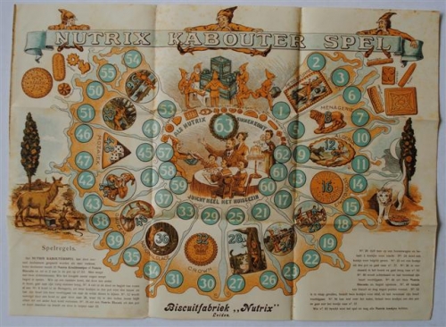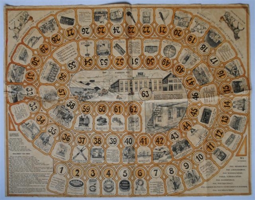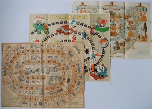 See the Dutch description: Biscuitfabrik Nutrix Leiden, ca. 1930. + Pax Polish Spel, Pax Polish Co, Hilversum, ca 1920. Beide spelen in de vorm van een ganzenbord. & Het Spaarspel, aangeboden door spaarbank "Nut en Genoegen", Aalsmeer.
