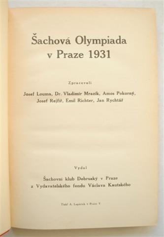Sachova Olympiada v Praze 1931. red. J. Louma, V. Mrazik, A. Pokorny, J. Rejfir, E. Richter, J. Rychtar. publ by Sachovni klub Dobrusky v Praze. 1932
