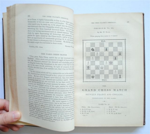 8vo. orig. linen. gilt lett. br. sp. at fr.c. and fly-leaf. notes on fly-leaf. owners name on in.c. [Andres Fernandez Pozo]. 400 pp. The Chess Players Chronicle was the first important English-language chess magazine. V.G. copy. L/N 6123