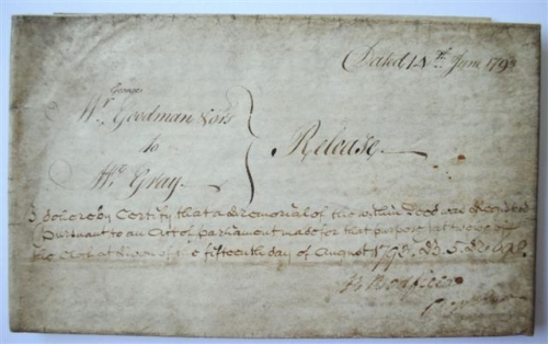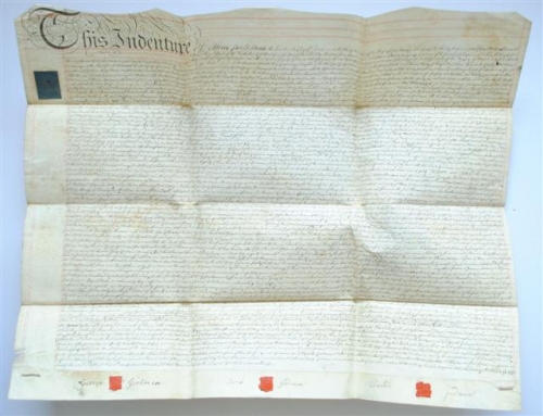 This item contains no English description. See the Dutch description: Brits manuscript met zegels en stempel waarin o.a. vastgelegd wordt dat de heer Richard Gray 380 pond verschuldigd is aan de heer George Goodman. 65 x 84 cm.