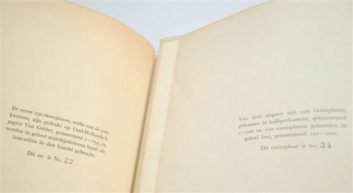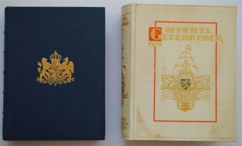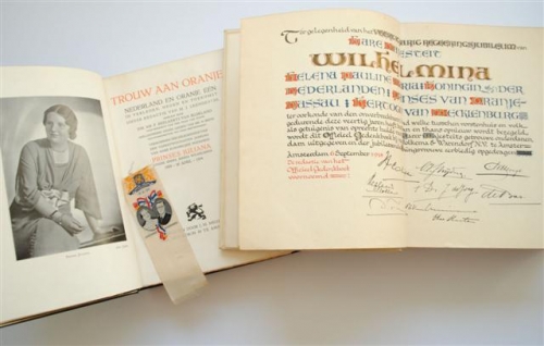 See the Dutch description: Uitgave t.g.v. het veertigjarig jubileum van Koningin Wilhelmina, red. W.G. de Bas, van Holkema & Warendorf N.V., Amsterdam. Eén van 100 exemplaren die in Kalfsperkament werden uitgevoerd. Dit is nr. 34. + Je Maintendrai, Trouw aan Oranje, uitg. t.g.v. de vijfentwintigste verjaardag van Prinses Juliana, Meulenhof, Amsterdam, 1934. Eén van 250 marokijnlederen banden. Dit is nr. 22.