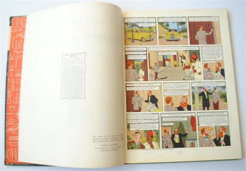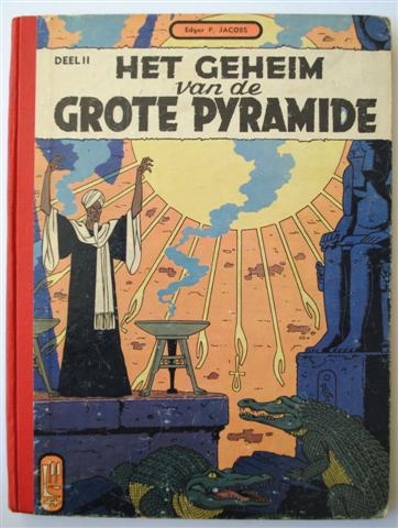 See the Dutch description: Edgar P. Jacobs. Het geheim van de grote Pyramide deel II. Lombard, 1955. Gebonden uitg. met linnen rug.