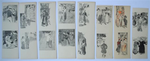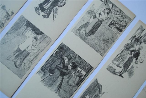 See the Dutch description: Lot van 8 proefdrukken op karton. Elk in sets van 2 kaarten op strook. 7 Sets zw.wit, 1 set in kleur. Achterzijde nog onbedrukt. In stockstaat.