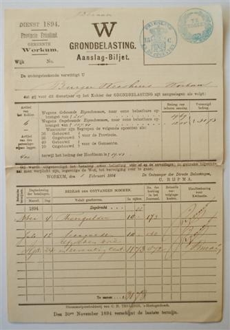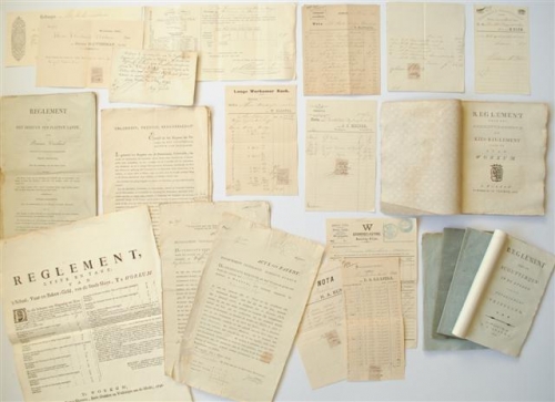 See the Dutch description: Reglement voor de Bataafsche gewapende Burgermacht binnen Workum, Even Wed. P. Olingius, 1798. 28 pag. + Reglement voor de Schutterijen in de steden van het departement Vriesland, F.A. Annema, 1814 + Reglement Trekschippers, 1828, 37 pag. + Reglement op het ter verkoop of Consumtie invoeren van Vleesch, Meel, Brood en Wyn, Folkert Annes, 1808, reglement voor het gemeente-bestuur en Kies-reglement voor de stad Workum, Is. Verweij, 1805, reglement op het bestuur ten Platten Lande, in de Provincie Vriesland met Notificatie Belastingen 1814 - en enkele andere pamfletten en acten van patent (4x) - en 9 nota's, allen uit 1894/1895, o.a. Bierhandel J.J.Meijer, Stoomgrutterij D.S.Gaastra en Wolkammerij H.A.Runia. (12x)