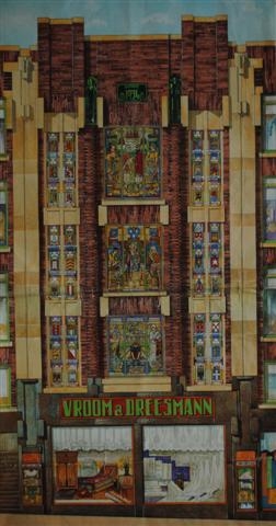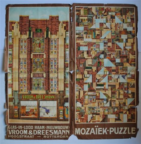 See the Dutch description: Knip- en legpuzzel met aan een zijde het uit te knippen deel, de andere zijde de complete plaat waarop de voorgevel van het pand, uitgegeven bij gelegenheid van de officiële opening der nieuw herbouwde magazijnen van de Firma Vroom & Dreesmann aan de Hoogstraat, Rotterdam.