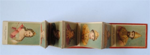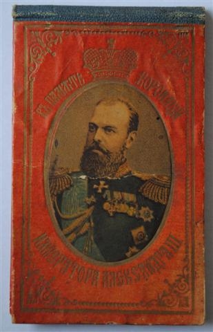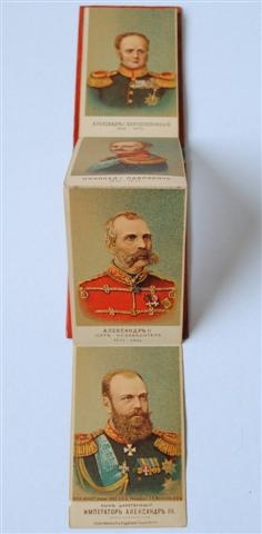 See the Dutch description: Rusland, 1882. 6 x 9,5 cm. Uitklapbaar boekje met 16 gelith. portretten van de Russische tsarenfamilie, van Michael Romanov (1613-1645) tot de nieuwe keizer Alexander III, die de troon besteeg nadat de vorige keizer Alexander II in 1881 bij een bomaanslag het leven verloor.