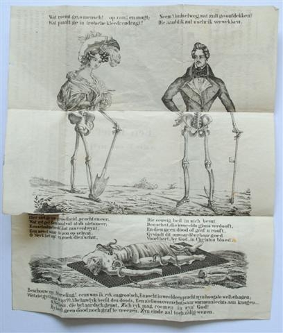 De tekst luidt: "waar ik zocht in weelde en pracht myn hoogste welbehagen; Wat ziet gy thans in my? Afschuwlyk beeld des doods, Een zielloos overschot, waar wormen slechts aan knagen". Bij al dit slechte nieuws is er gelukkig de mogelijkheid van een zalig einde, bij "het roemen in zijn God". Vouw linksonder wat ingesch. verder goed ex. Afm. 22 x 26 cm. Porto 10 cents.