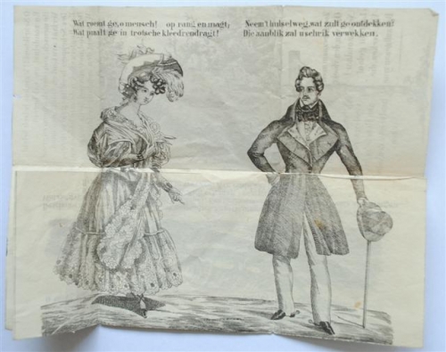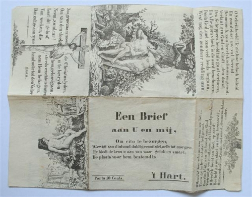 See the Dutch description: 19e eeuws. Een Brief aan U en Mij. Om cito te bezorgen. Gezonden door Hart, dat waarschuwt te waken voor zondelust, praaltrots etc. Fraai illustratief uitklapblad, waardoor jurk en broek veranderen in beenderen.