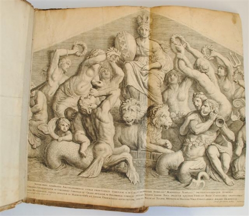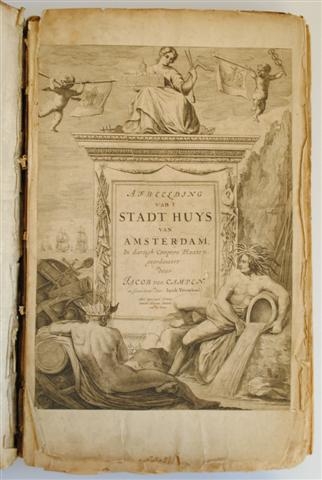 See the Dutch description: in dartigh Coopere Plaaten geordineert door Jacob van Campen en Geteeckent door Iacob Vennekool, 1665. Gehavend exemplaar met 28 van 30 platen, meest gerest. enkele niet volledig. + Het eerste deel van de voornaemste Statuen ende Craten van konstrijck Stadthuys van Amstelredam, tmeest in marmer gemaeckt door Artus Wuellinus, Beelthouwer der voorseyde Stadt, gedruckt ten huyse van Frederick de Witt, 1665. Met 4 uitklapplaten, verstevigd aan achterzijde en 42 platen + Het Tweede deel, 1668, met 40 platen, waarvan 4 halfpag. uitklapbladen. Enkele gerest. De drie dln. in een band.
