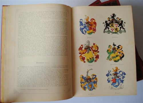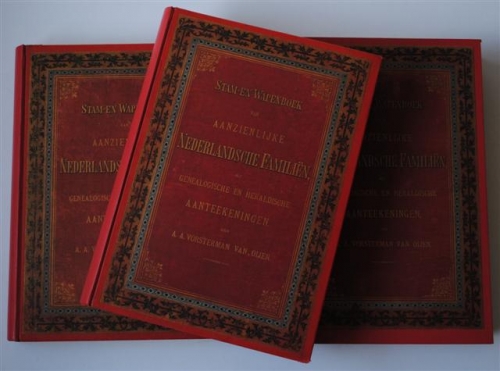 See the Dutch description: Met genealogische en Heraldische Aanteekeningen door A.A. Vorsterman van Oijen. 3 dln. Folio, 45 x 31 cm. Met in totaal 624 familiewapens op 104 pag. 359(3), 415, 502(19) pag.
