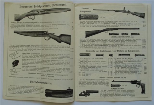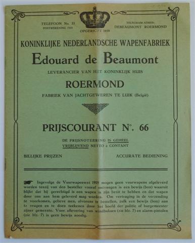 See the Dutch description: Koninklijke Nederlandsche Wapenfabriek Edouard de Beaumont, Roermand. Fabriek van Jachtgeweren te Luik. Catalogus nr 66, 1925. 20 pag. Met geweren, asscecoires als Duivenwerpmachinen en jachthoorns.