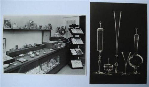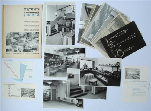 See the Dutch description: Gids Bouw-Woninginrichting-Kleeding. Hoesontwerp met 8 pagina's voorlopige inhoud (Leerdam en Voorschoten als voorbeelden). Proefdruk met omslagontwerp Ehrlich. + 10 foto's van winkelinrichtingen door Ehrlich, o.a. Begeer v. Kempen-Vos + en een tentoonstellinguitnodiging 1932 voor "Groupe des Artisans Francais Contemporains" bij Begeer. - En 3 andere.