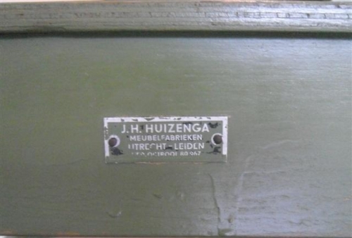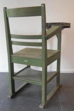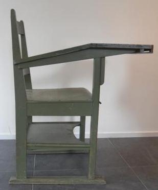 This item contains no English description. See the Dutch description: Houten stoel, groen/zwart met opklapbare schrijfblad. Ca. 1920. Gemaakt door Huizenga Meubelfabrieken, Utrecht-Leiden. 90x50x69cm