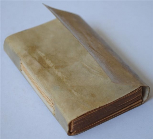 In perkamenten bindsel. Eerste paar pag. aan rand naar binnen gekruld, frontisp. gaatje van ca. 2x2 mm. Verder goed.