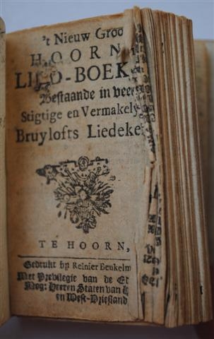 See the Dutch description: 't nieuw groot Hoorns lied-boekje, bestaande in veel stigtelijke en vermakelijke bruylofts liedekens. Reinier Beukelmans, Hoorn, ca. 1720. 311(9)pag.