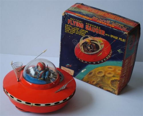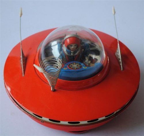 See the Dutch description: Cragstan For Toys. Vliegende schotel met springveer en 2 antennes. Made in Japan, ca 1960. Ongebruikt exemplaar.
