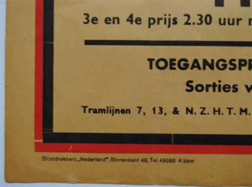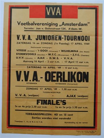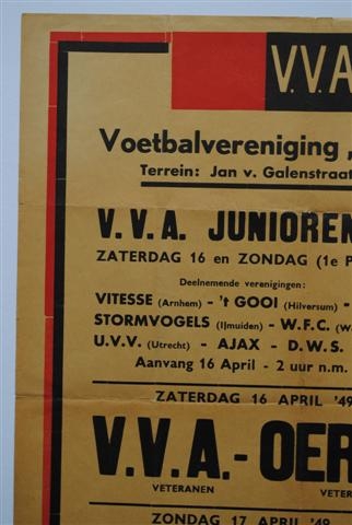 See the Dutch description: Affiche 1949 met aankondiging van het V.V.A. Junioren-Tournooi, met deelname van o.a. Vitesse, Ajax, Z.F.C. en Stormvogels. Welpenwedstrijd V.V.A tegen Ajax en V.V.A.-Oerlikon veteranen wedstrijd. Biljetdrukkerij "Nederland", Amsterdam.
