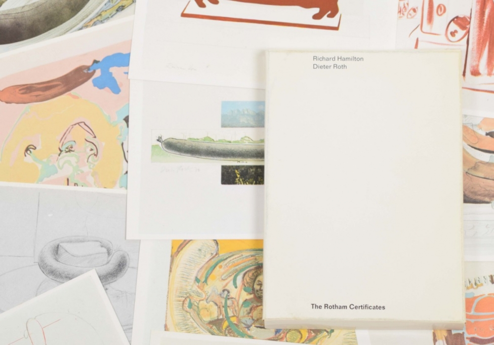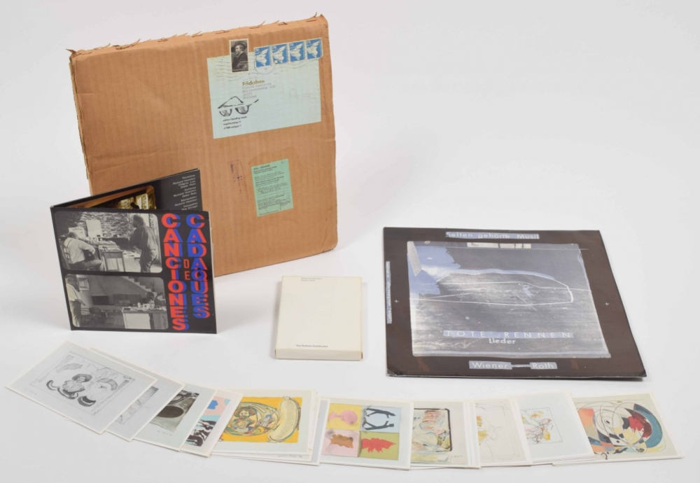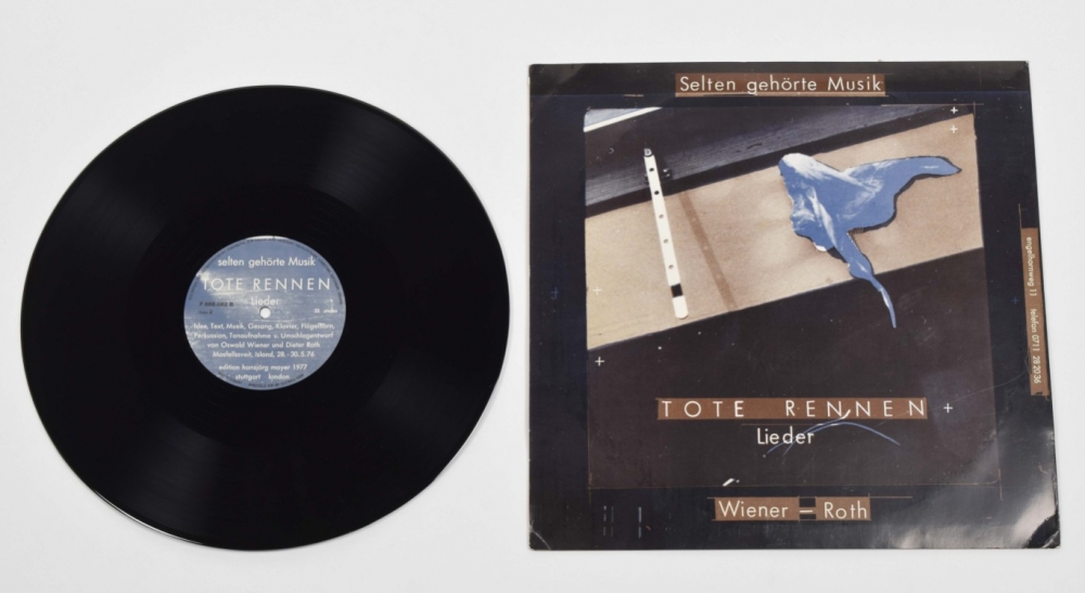 Oswald Wiener und Dieter Roth. Selten gehörte Musik. Tote Rennen. Lieder. Edition Hansjörg Mayer, 1977, Stuttgart, London + Richard Hamilton/ Dieter Roth. Canciones de Cadaques. Double 45 rpm in orig. sleeve. Hansjörg Mayer, 1976. Added: Richard Hamilton/Dieter Roth. The Rotham Certificates. Suite Two. Box with 40 cards.