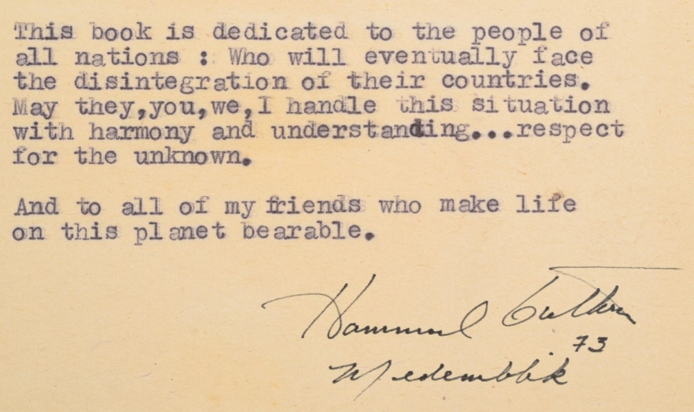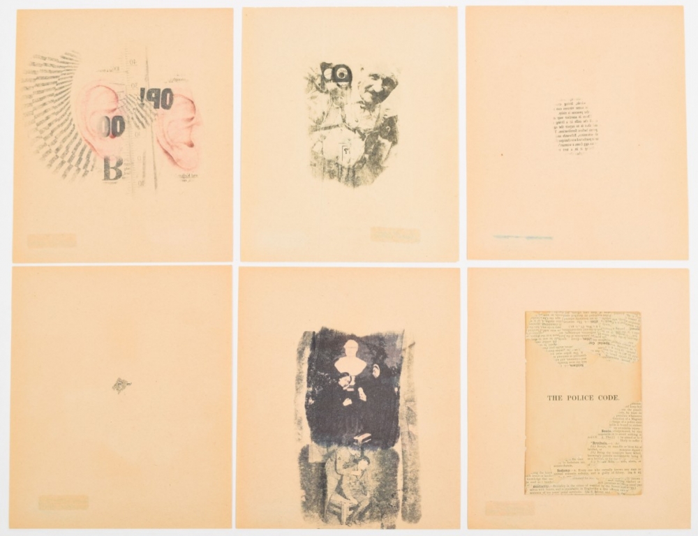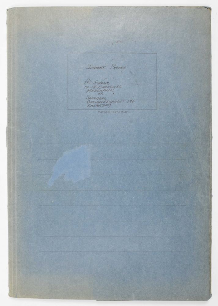 Unpublished original manuscript from the archive of Willem Sandberg. Blue portfolio with the title and the addresses of Guthrie's studio and Sandberg's home on the cover. Contains 34 loose leaves, 24 x 20 cm, with hand press, rubber stamp and collages intended to be printed as an artists' book. Each page is titled, signed and dated on verso.