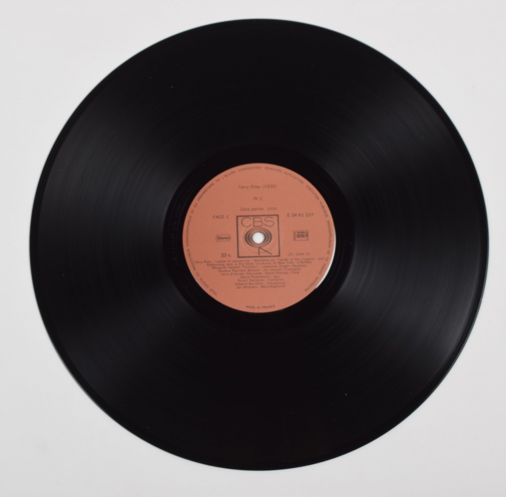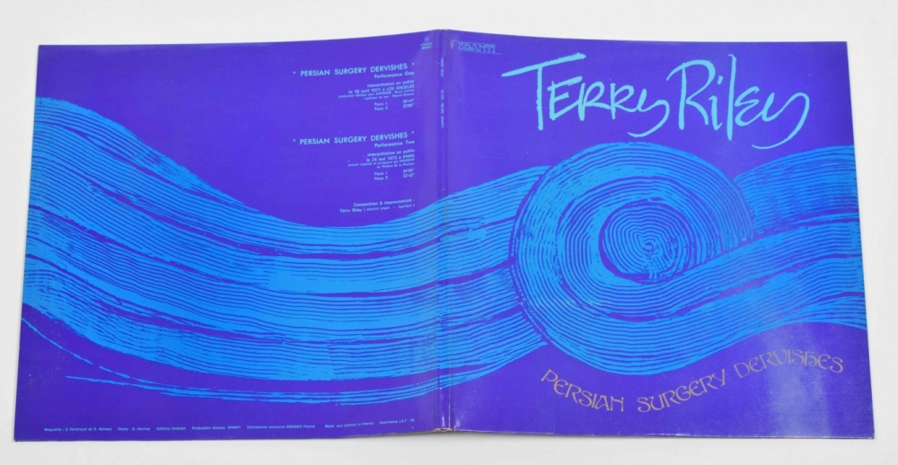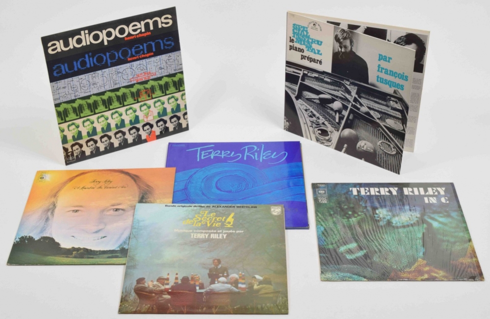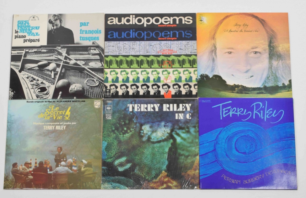 33 rpm. Terry Riley in C. CBS 34-61237. Music of our time. France, 1968 + Persian Surgery Dervishes. Shanti 83501. France, 1972. Gatefold sleeve. Small open strip on spine, else excellent copy + Le Secret de la Vie. Musique composée et jouée par Terry Riley. Bande originale du film de Alexander Whitelaw. Philips 9120037, France, 1975. + A rainbow In Curved Air. CBS 64574, 1971. Added: Henri Chopin. Audiopoems. TGS 106, 1971. Excellent copy - and François Tusques. Special Instrumentental. Le Piano préparé. Le chant du Monde LDX 74483.