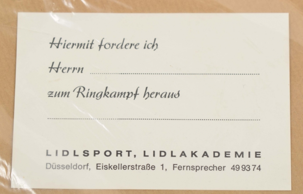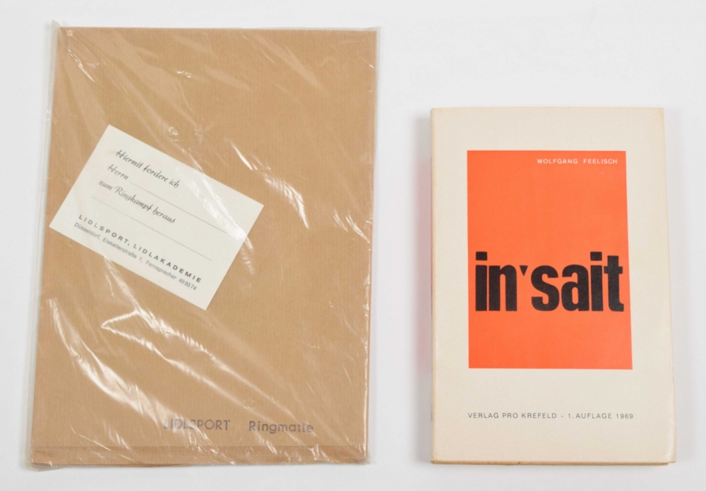 Two multiples incl. Jörg Immendorff, Lidlsport Ringmatte, 1969. Kraftpaper sheet, hand stamped with title in original plastic bag with inserted text card. 19 x 26 cm. Unfolds to 75 x 100 cm, to be used as wrestling mat. Unlimited and unsigned edition published by Vice-Versand/Wolfgang Feelisch, Remscheid. Slight wear to cover, else mint.